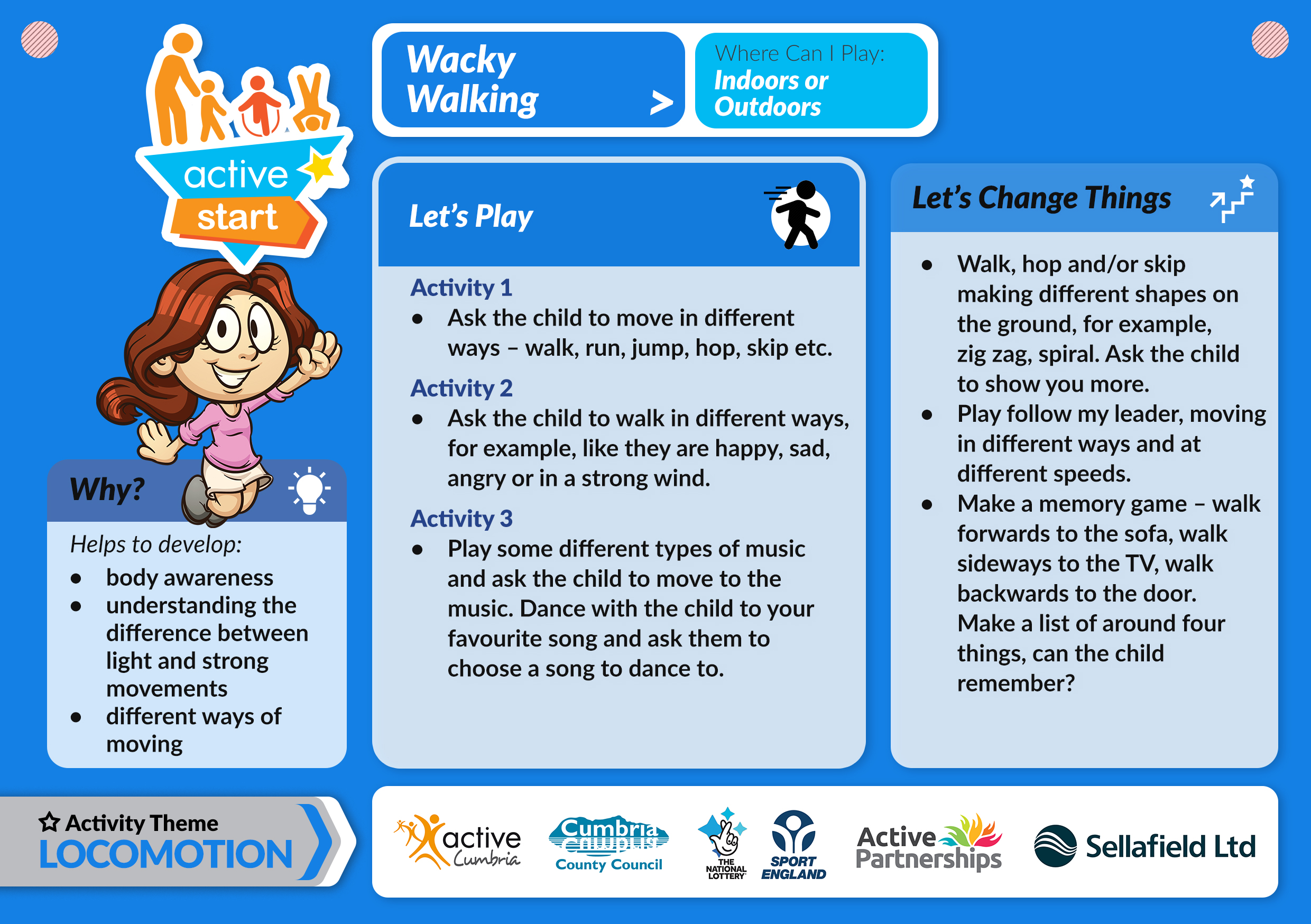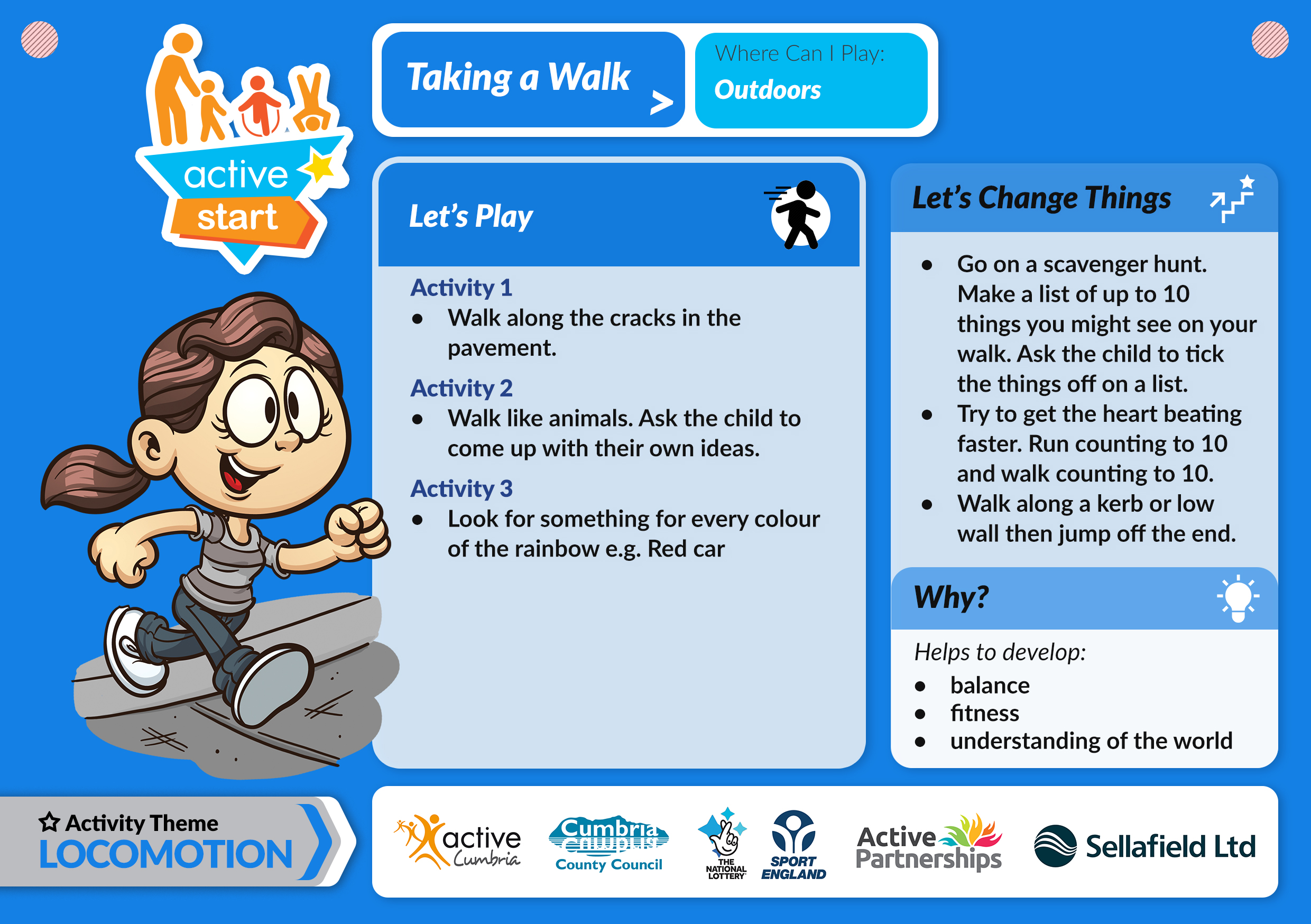 Active Start for Early Years - Walking provides many opportunities to socialise and communicate with our little ones. What can they see and what can they hear when they’re out and about? Encourage them to move in different direction – backwards, sideways, circles or zig-zags. Why not try walking like their favourite animals or even go on a scavenger hunt. Help early years children to embark on an active start by venturing out and about during National Walking Month.